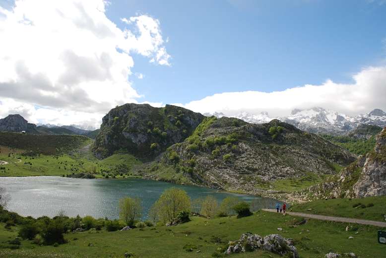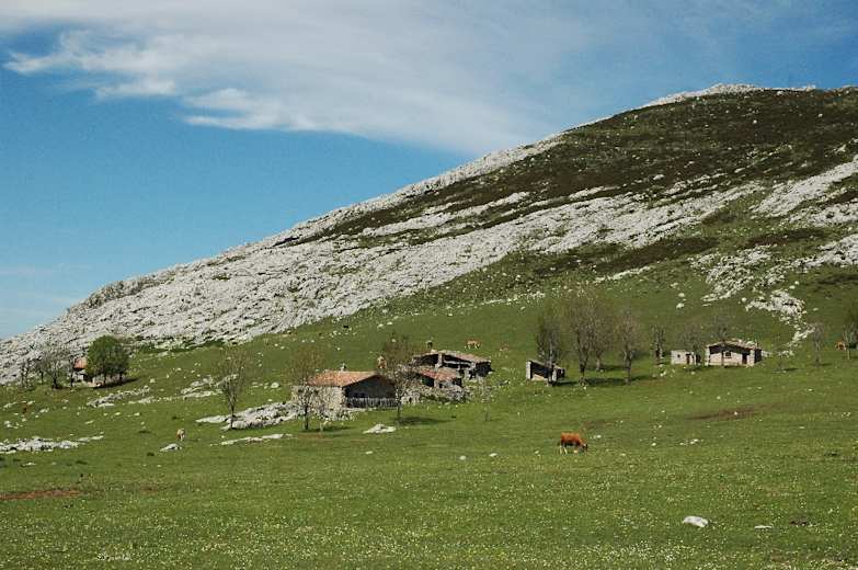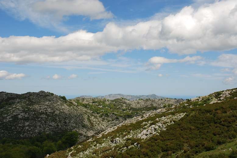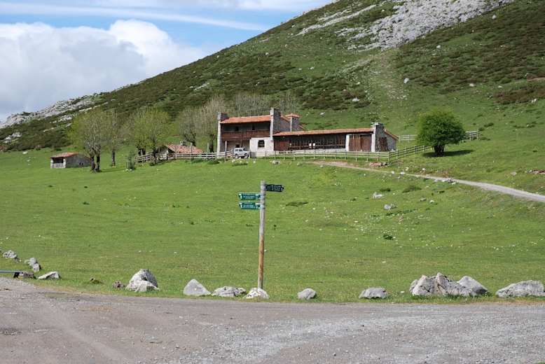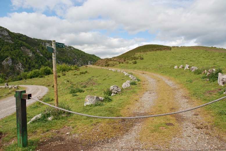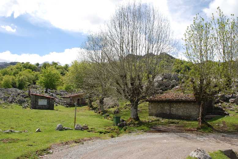 Vom Parkplatz Buferrera gehen wir auf der Zufahrtsstraße zurück zum Lago de Enol (1.075 m), folgen der Straße rechts und biegen dann links in den Pfad am Seeufer entlang ein (oder folgen einfach der Straße weiter und dann links Richtung Bar/Refugio de Enol). Der Uferpfad stößt auf eine Schotterstraße, nach gut 30 Min. passieren wir den Abzweig zum Refugio de Enol. Vorbei an den Almhütten der Vega de Enol führt die Schotterstraße in sanften Wellen an den in der Senke Vega de la Cueva liegenden Alm vorbei zum Collado de Pandecarmen (1.085 m, etwa 30 Min. seit Refugio Enol).
