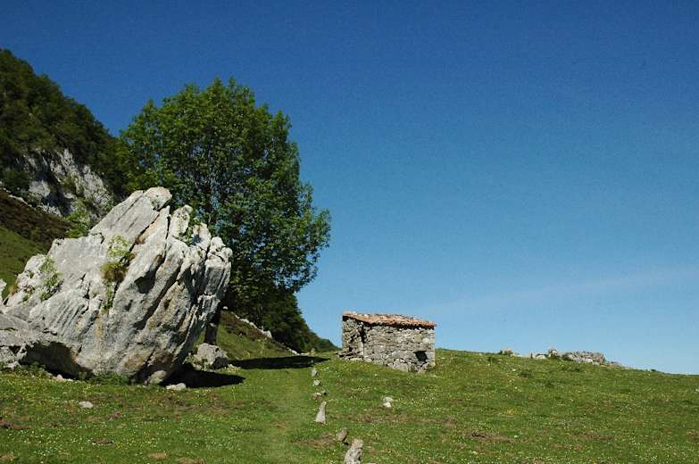 Jetzt beginnt eine weniger gut ausgebaute Forststraße. Leicht bergab führt sie zur hübsch in einer von Buchen umgebenen Senke gelegenen Alm Vega el Huerto (1.065 m). Kurz danach überqueren wir über eine Brücke den Bach Río Pomperi nach rechts und steigen nun den schmaleren Fußweg leicht bergan. Wenig später knickt er scharf rechts ab. Ein Brunnen wird passiert, weiter auf dem Hauptweg folgen wir den gelb-weißen Markierungen nach scharf links oben und gelangen zur Vega und Majada de la Piedra (1.130 m; 30 Min. seit Pandecarmen).
