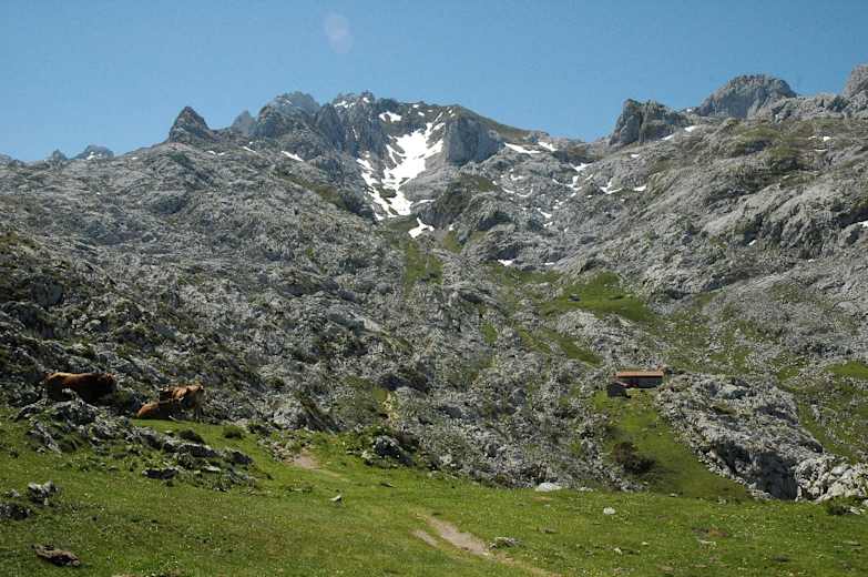 Nach dem kurzen, steilen Anstieg erreichen wir nach knapp 30 Min. die Vega de Canrasu (1.235 m), eine in einem flachen, kleinen Hochtal gelegene Weide. Wieder orientieren wir uns an der Steinkette, die uns leicht links über die Wiese zu einem ansteigenden Trampelpfad bringt. Wenig später durchziehen viele von Mensch und Tier ausgetretene Pfade die grünen Matten, ziehen sich im Zickzack den Hang hinauf. Vor uns bauen sich die Gipfel des Westmassivs auf, bis weit ins Jahr leuchten weiße Schneefelder auf dem grauen Kalkstein. Nach knapp 30 Min. seit Canrasu stehen wir in der halb verfallenen Alm La Rondiella (1.352 m). Etwa die Hälfte der zu bewältigenden Höhenmeter haben wir geschafft, die Baumgrenze ist überschritten, Almwiesen bilden die einzige Vegetation.