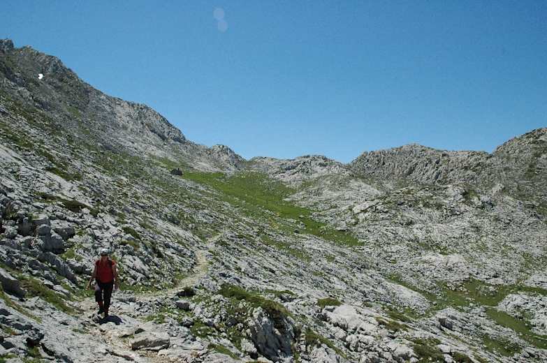 Zunächst steigen wir über einen sehr steinigen Pfad bergan. Er wird bald besser, gewinnt in leichten Serpentinen an Höhe und erreicht nach rund 0,5 Std. den Rand einer kleinen Senke. Wir durchqueren das einer Mondlandschaft ähnelnde Kar, steigen wieder leicht bergan und folgen dann dem mäßig steilen Höhenpfad am Hang entlang, rechts reicht der Blick an klaren Tagen bis zum Meer. Nach knapp 45 Min. (ab der Senke) sehen wir schräg links oben das alte Refugio de Ordiales (1.705 m), zu dem wir über die Almwiese aufsteigen.
