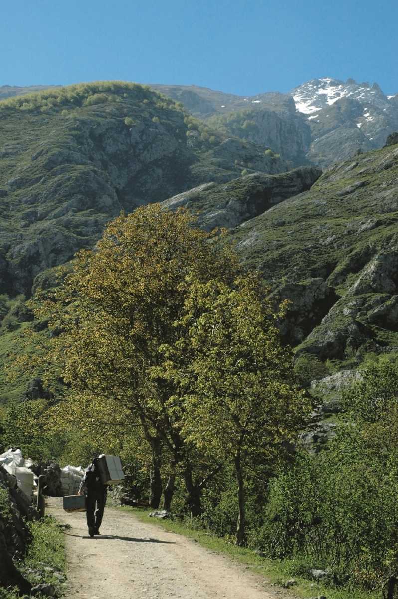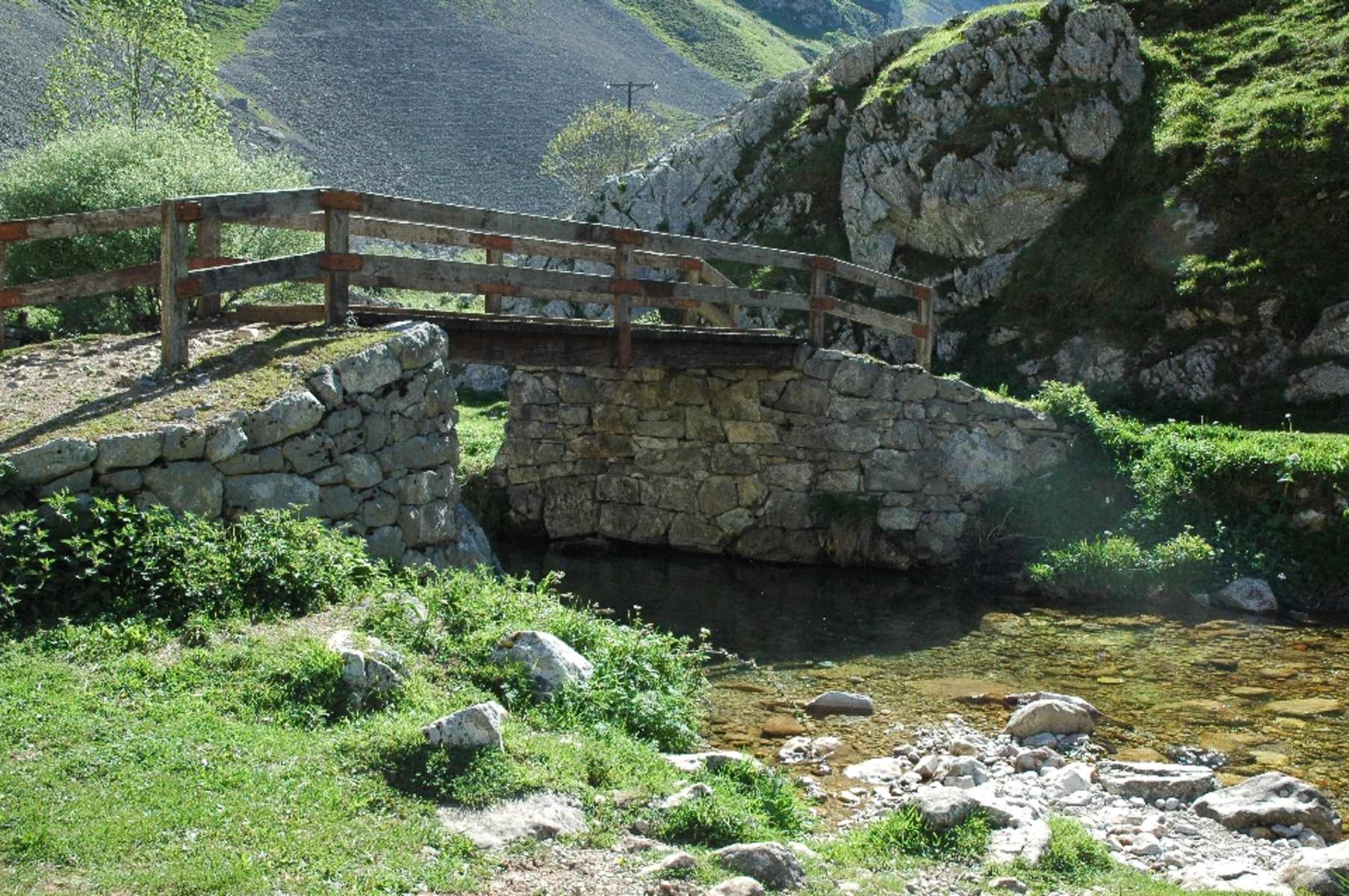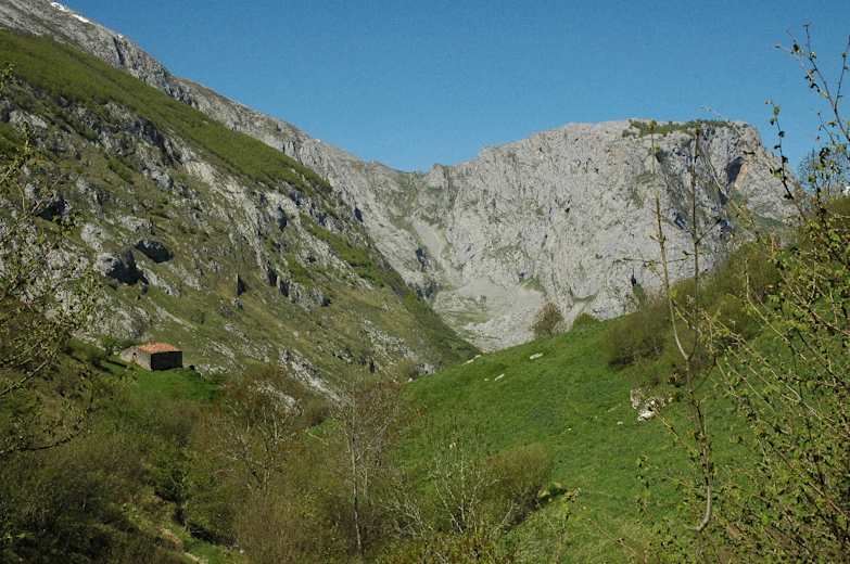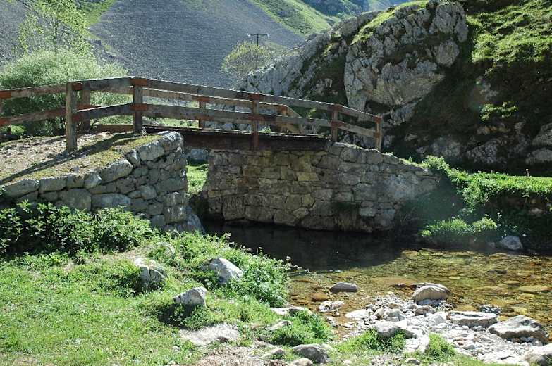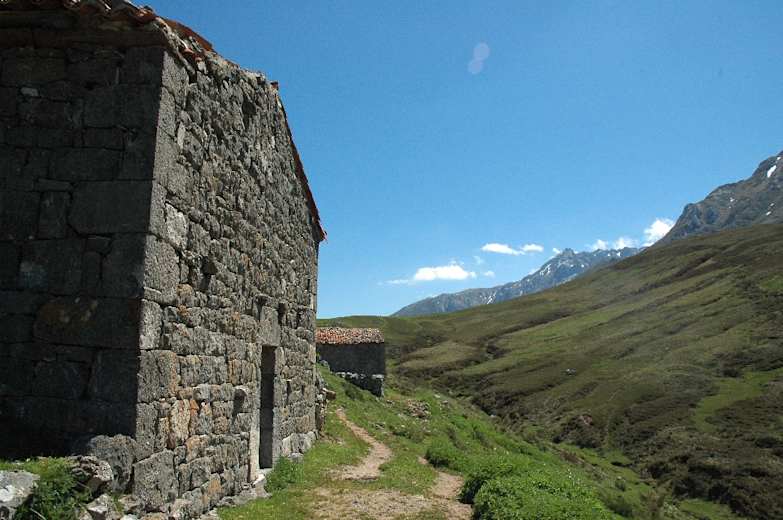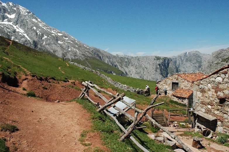 Etwas flacher folgt der Pfad einem kleinen Bachlauf (Reguera del Toral) und überquert ihn drei Mal (erst über einen Steg, dann über Trittsteine). Dann geht es wieder bergauf und bald ist rechts wieder der Picu zu sehen. Nach ungefähr 15 Min. liegen die verstreut stehenden Steinhütten der Majada La Jelguera (96 m) am Weg.