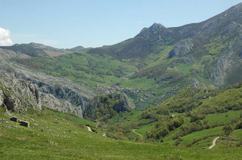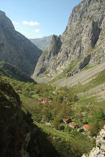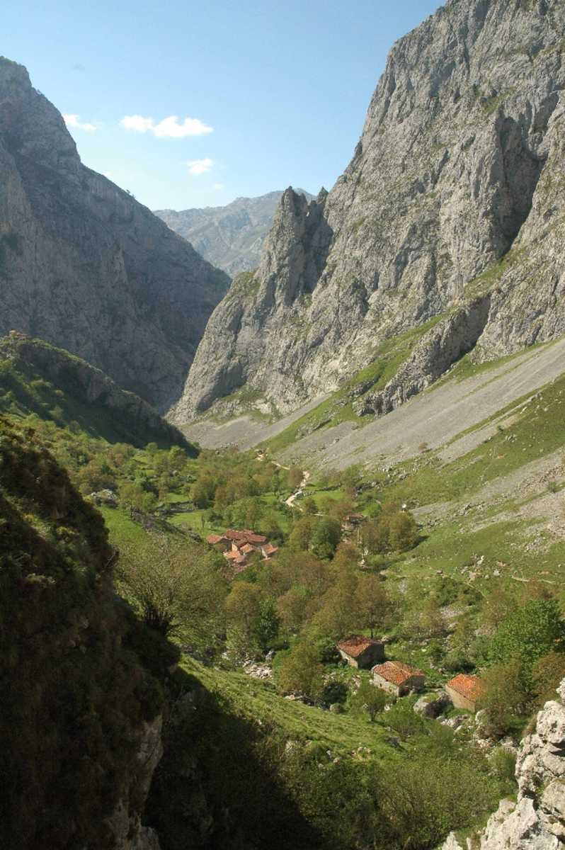 Mit Aussicht auf die Buchenwälder am Monte de la Varera rechts zieht sich der Pfad nach der Alm erst moderat ansteigend, dann immer steiler am kahlen Hang des Monte de la Varera hinauf zur Passhöhe Collado Valleju (542 m). Vor uns öffnet sich ein herrlicher Ausblick auf das riesige, schroffe Tal Hou Llunegu mit dem Picu Urriellu darüber. Nach Norden schweift der Blick durch das tiefe Tal auf die jenseitige Bergkette und dahinter bis zum meerblauen Horizont.