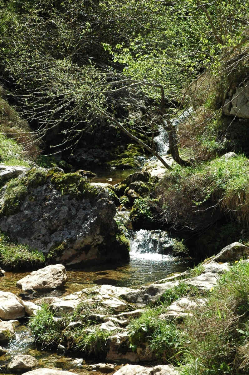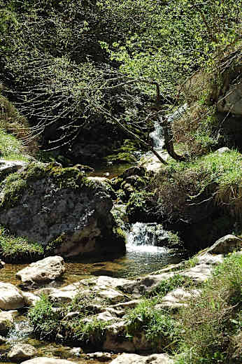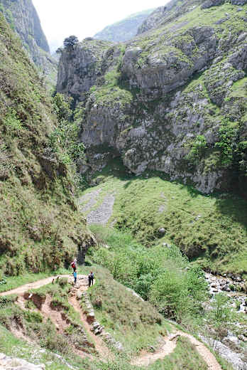 Der Weg verläuft anfangs rechts, dann links vom Bach. Da er nicht immer eindeutig ist, suchen wir den besten Pfad durch die Talsohle. Nach etwa 25 Min. wird der Weg flacher und besser und wir halten uns eher auf der linken Seite. Noch einmal geht es merklich hinunter und schließlich durch eine schmale Klamm aus der Schlucht in das Tal von Bulnes. Zunächst gehen wir geradeaus am Schild Canal de Balcosín vorbei, dann gleich links um die kleine Felskuppe herum und auf dem schmalen Pfad steil hangabwärts.