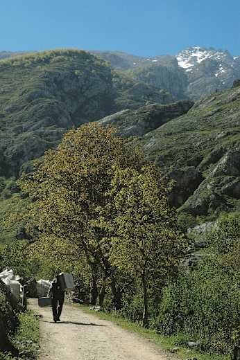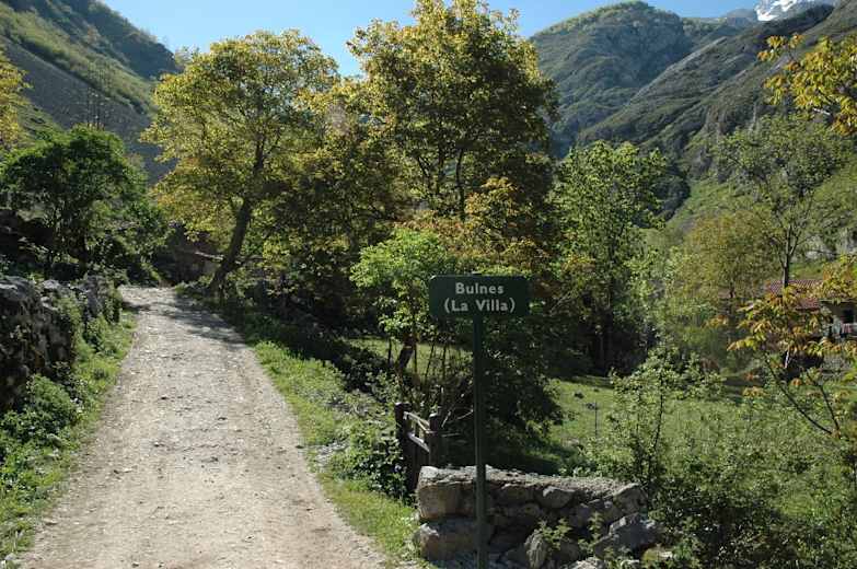 Der Anfang der Wanderung ist bis nach Bulnes (650 m; ca. 1,25 Std.) identisch mit Tour „Bulnes – El Castillo“. Wir durchqueren den Weiler links des Baches und folgen am Ortsende dem Schild leicht links zum Aussichtspunkt Vista Naranjo de Bulnes/Pandébano. Steil und teils steinig steigt der alte Verbindungspfad zwischen Bulnes und Sotres bergan.