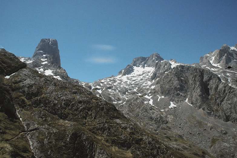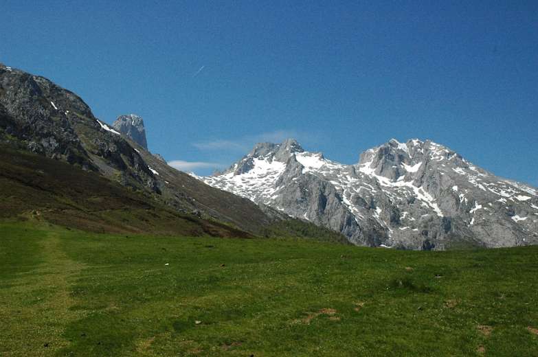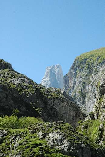 Nach gut 10 Min. ab Bulnes öffnet sich rechts der Blick auf den eleganten Picu Urriellu mit seinen glatten, senkrecht abfallenden Wänden. Der Weg schlängelt sich weiter steil bergan. Die rot-weißen Markierungen des GR-202 (Ruta de la Reconquista) geben Orientierung. Nach etwa 30 Min. bietet ein kleines Hochtal eine Erholungspause.
