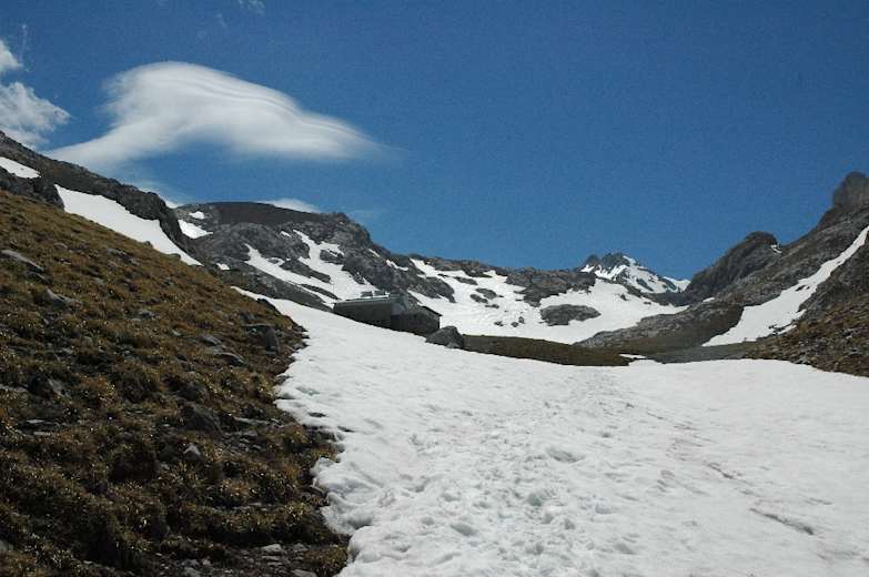 Nach knapp 15 Min. ab dem Pass dreht der Pfad wieder nach links und gewinnt als schmales Band am Hang entlang an Höhe. Nochmals 15 Min. später durchqueren wir ein Feld riesiger Felsbrocken. Dann beginnt der letzte, rund 1-stündige Anstieg zum Refugio. Ohne Schnee ist der breite Weg unfehlbar zu erkennen, bei Schnee geben die Spuren anderer Wanderer Orientierung, bis wir das Refugio de Urriellu (1.960 m) erreichen.