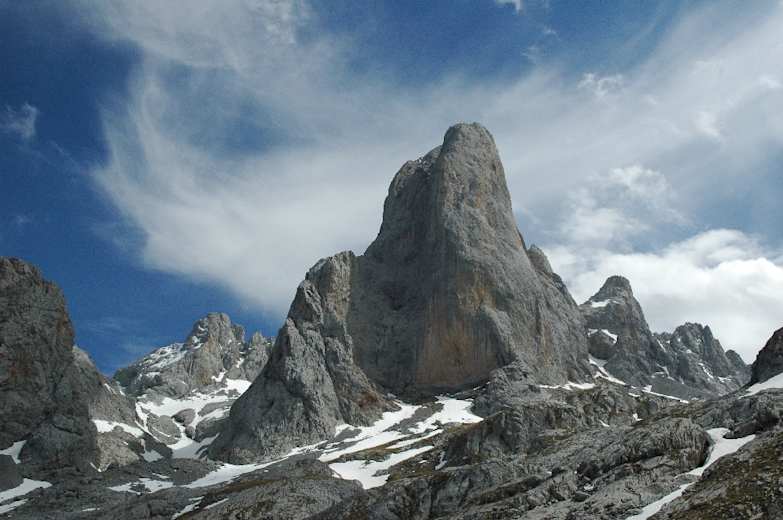 Aufstieg zum Fuß des legendären Picu Urriellu in Spanien: Diese anspruchsvolle Rundtour führt zum Fuß des 2.519 m hohen Picu Urriellu. Der markante Berg mit der 550 m senkrecht aufragenden, glatten Westwand und dem scheinbar ebenen Gipfel in der Region Asturias gilt als Wiege des hochalpinen Bergsports in Spanien.