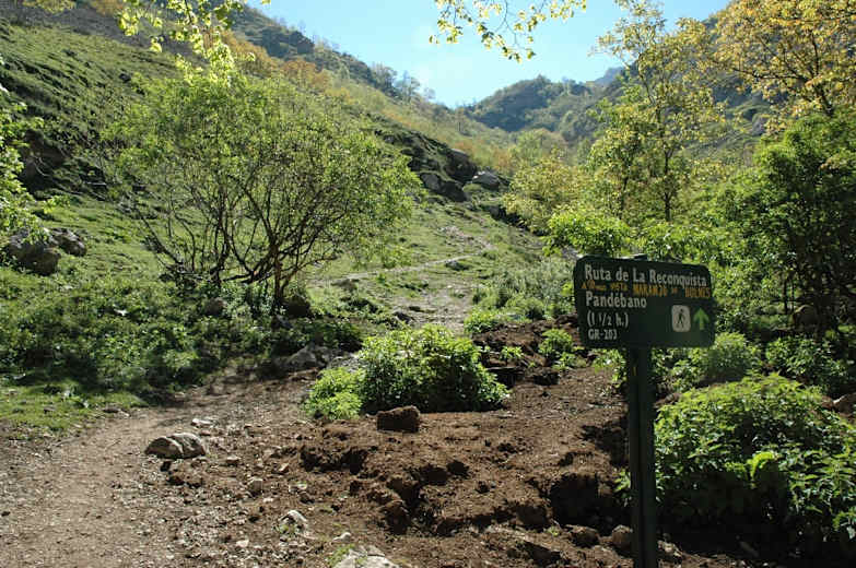Nach der Alm Entremosquines (1.185 m) halten wir uns leicht links und gelangen in 10 Min., vorbei an dem Schild geradeaus, über die Wiese zur Anhöhe Collado de Pandébano (1.218 m). Hier schlagen wir rechts den PR-PNPE 21 Vega de Urriellu zur am Berg liegenden Majada de la Terenosa (1.300 m) ein.