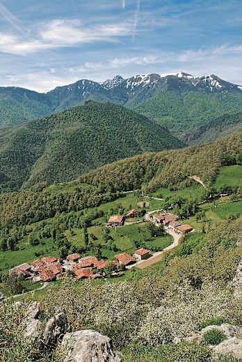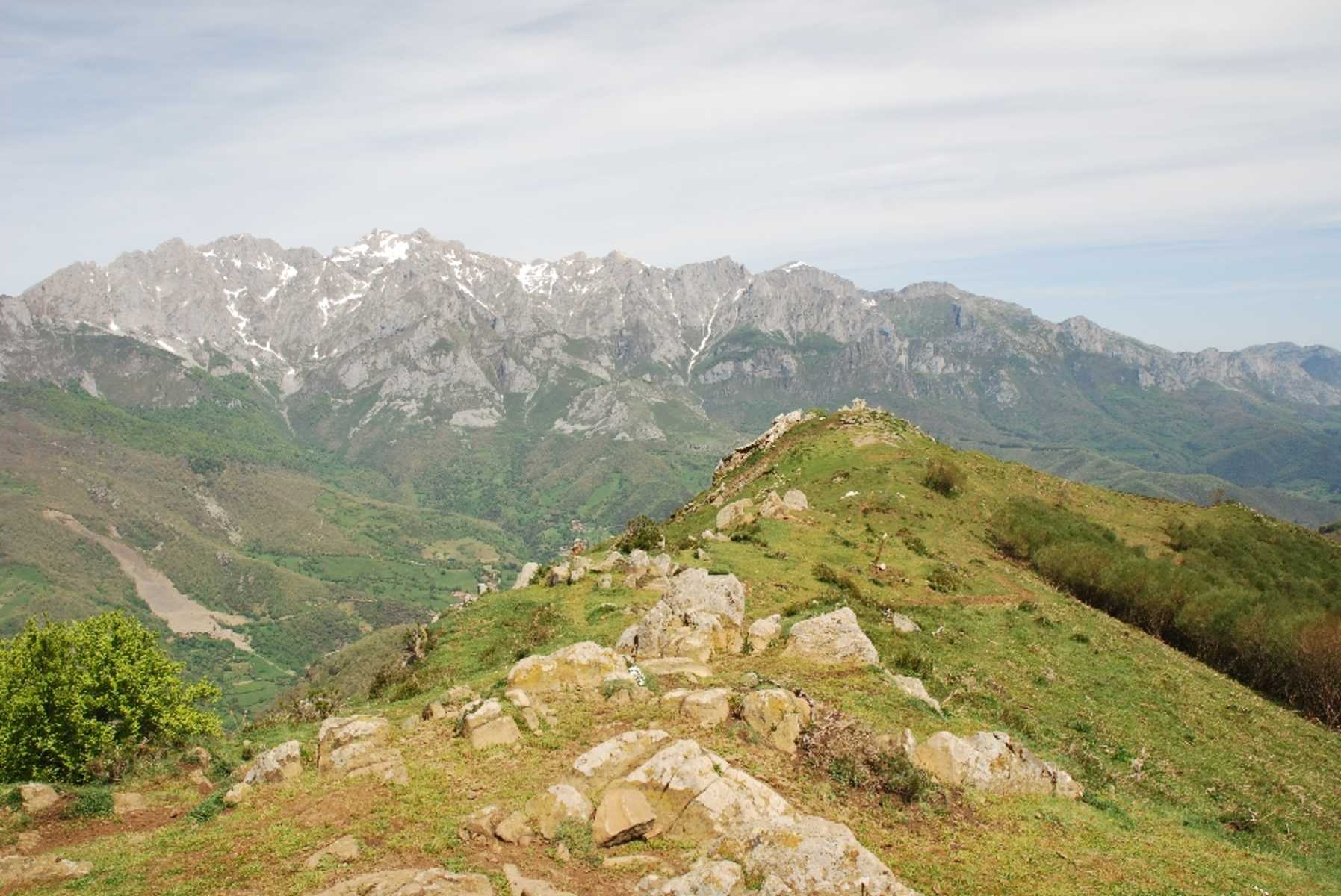 Vorbei an Birken, gelbem Ginster und weißer Buschheide gelangen wir in gut 15 Min. zu einer Forststraße und auf dieser in knapp 10 Min. bequem hinauf zur Gipfelsäule des Pico Jano (1.446 m). Wie eine Felsbastion ragen alle drei Massive der Picos de Europa über den grünen Hängen des Liébana-Tals auf. Nach Süden reicht der Blick unverstellt kilometerweit über die deutlich weniger schroffen Bergketten der Kantabrischen Kordilleren.