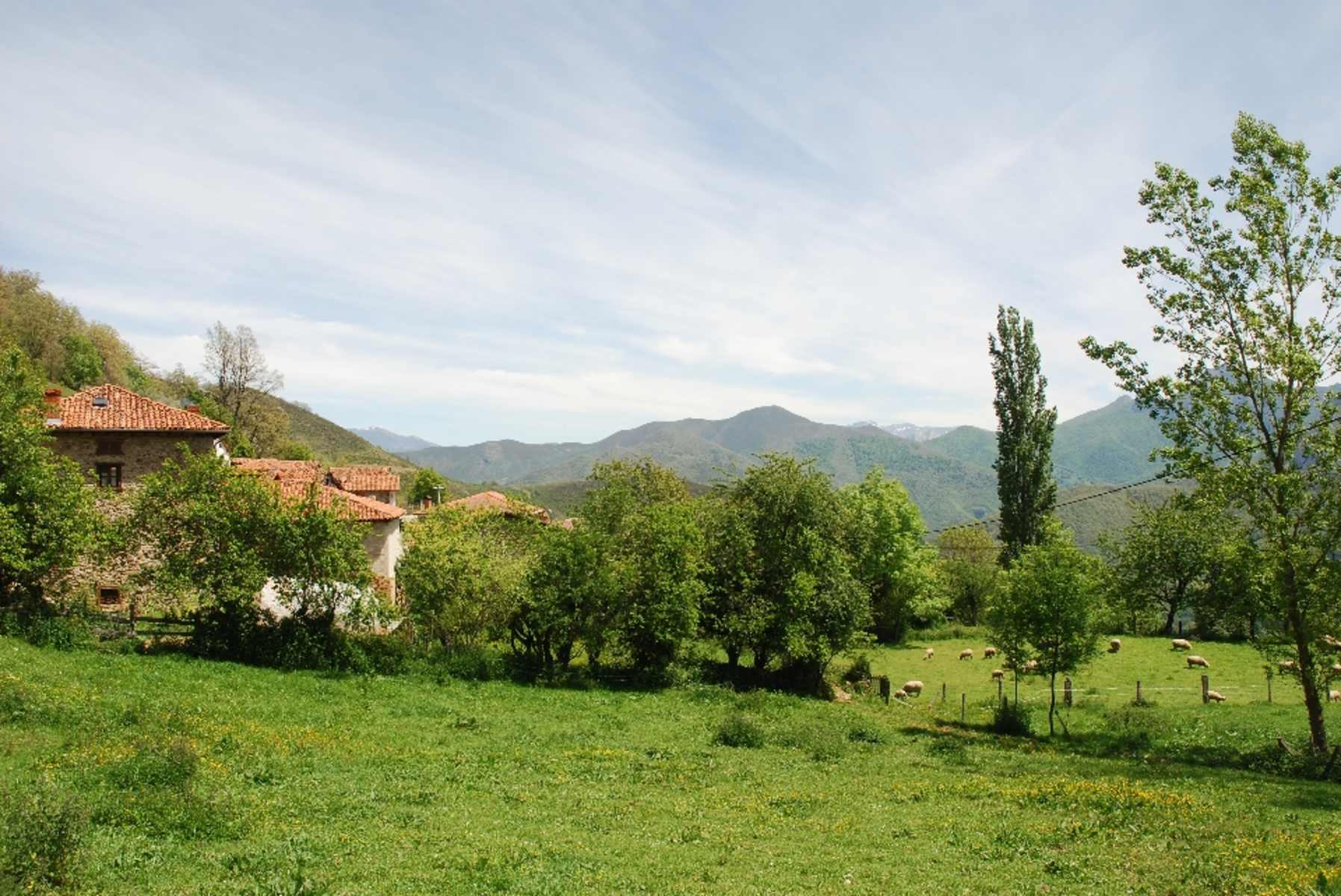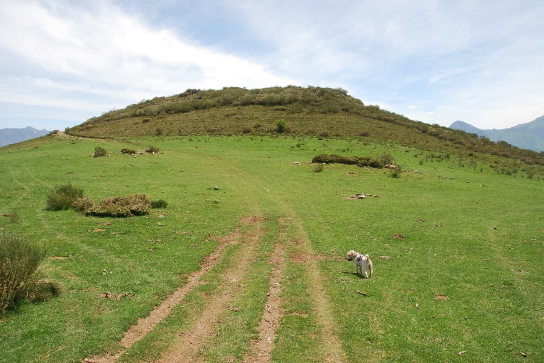 In Dobarganes folgen wir links neben den Mülltonnen dem mit „Pico Jano“ markierten Pfad bergauf. Er ist anfänglich steil und etwas unbequem, bald flacht er aber ab und gibt Blicke auf eine liebliche Weiden- und Waldlandschaft mit den kantabrischen Bergen im Hintergrund frei.