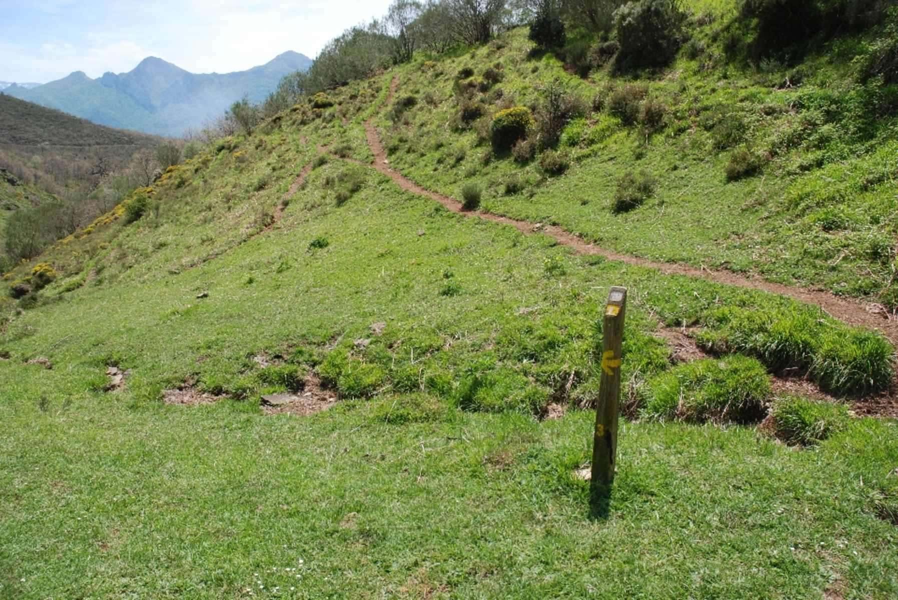 Nach rund 20 Min. nach dem Gipfel gelangen wir auf den breiten, grasigen Sattel Portillo de Agrajal. Der Wegpfosten (Nr. 26) war hier zuletzt umgekippt: Wir gehen nach rechts unten pfadlos über die Wiese, bei einigen Ginsterbüschen sollte Pfosten Nr. 27 wieder zu sehen sein.