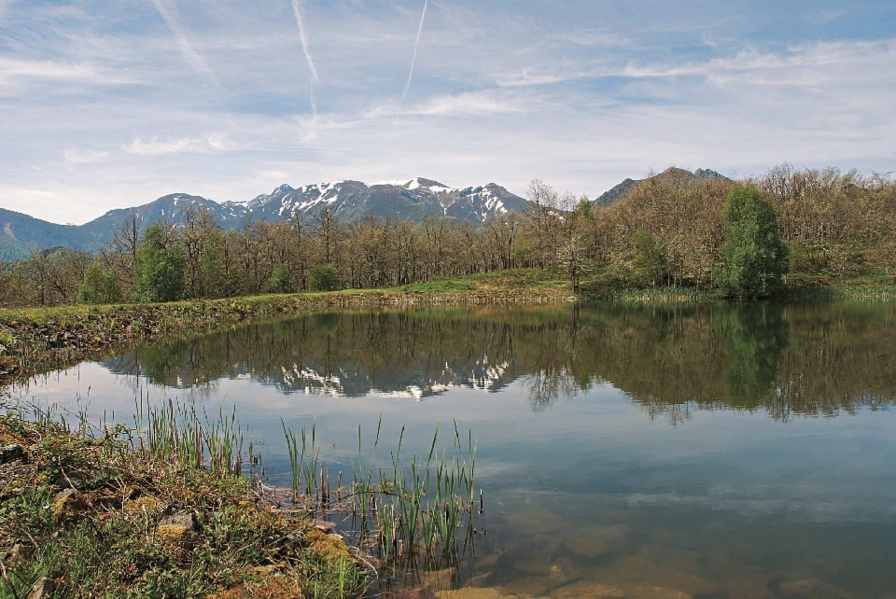 Rechts des lichten Waldes erstreckt sich eine Weide, darüber erhebt sich der Pico Jano. Bei der nächsten Gabelung gehen wir nach links unten und erreichen rund 15 Min. nach der Tafel einen hübschen Teich, in dem sich je nach Jahreszeit schneebedeckte Gipfel der kantabrischen Kordilleren spiegeln.