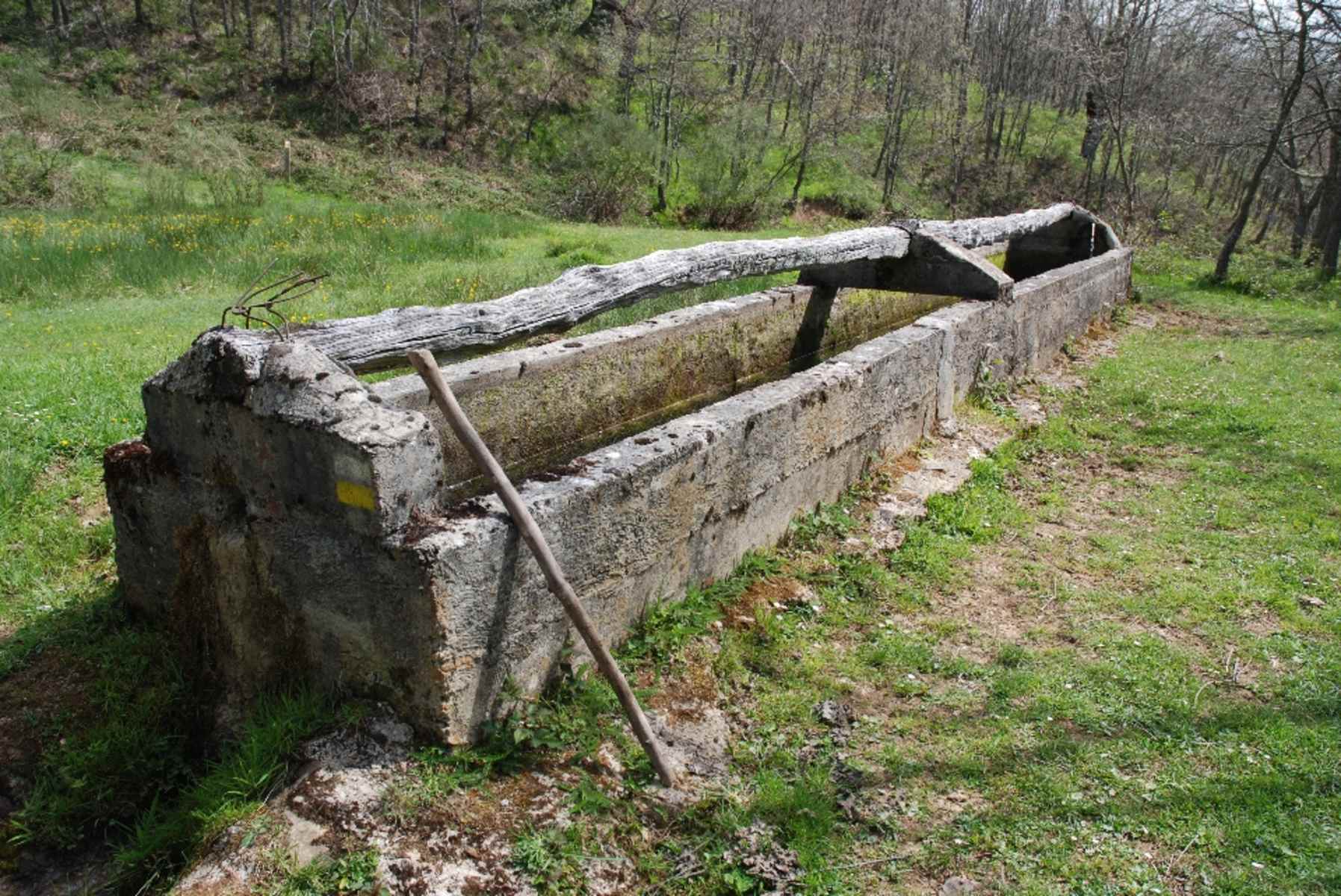 Wieder zurück gehen wir am Teich vorbei bergauf. Auf Höhe einer Viehtränke wird der Pfad eventuell etwas zertrampelt und morastig. Wir gehen nach rechts an der Tränke vorbei und danach nach links bergan zu einer Forststraße: Auf dieser nach rechts käme man in rund 2 km und 300 Hm auch bis kurz unterhalb des Gipfels. Der abwechslungsreichere, markierte Hauptweg führt jedoch geradeaus darüber und wird zum angenehmen Graspfad durch locker stehende Bäume.