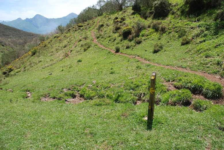 Bei Pfosten Nr. 17 steigt der Pfad über eine felsige Passage bergan, ein Rinnsal kann den Untergrund morastig aufgeweicht haben. Nach insgesamt gut 45 Min. ab dem Teich stehen wir auf einem kleinen, grasigen Sattel, der mit seiner Aussicht auf die Picos schon einen Vorgeschmack auf den Gipfelblick gibt. Wir gehen noch kurz geradeaus am Hang entlang weiter, dann schwenkt der Weg nach rechts oben.