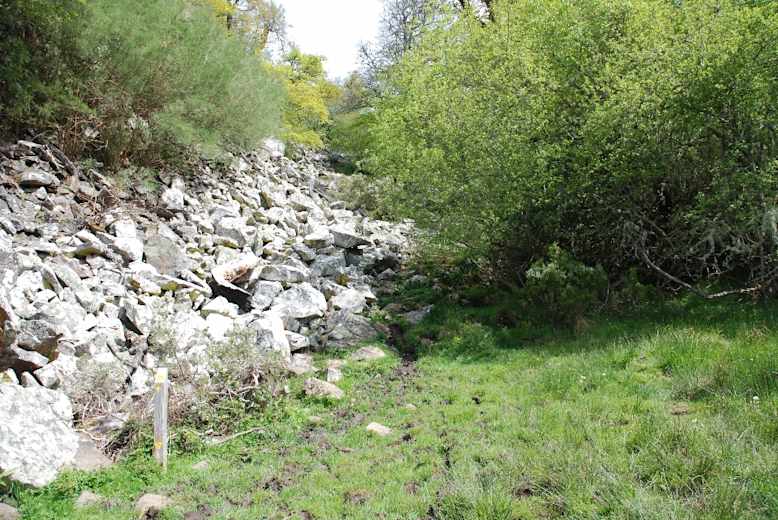Hier schlagen wir den Pfad nach scharf rechts ein. Er führt uns am anfangs bewaldeten, dann offenen Hang in 5 Min. in den Taleinschnitt des Arroyo Baorrín. Pfosten Nr. 31 fehlte hier zuletzt.
