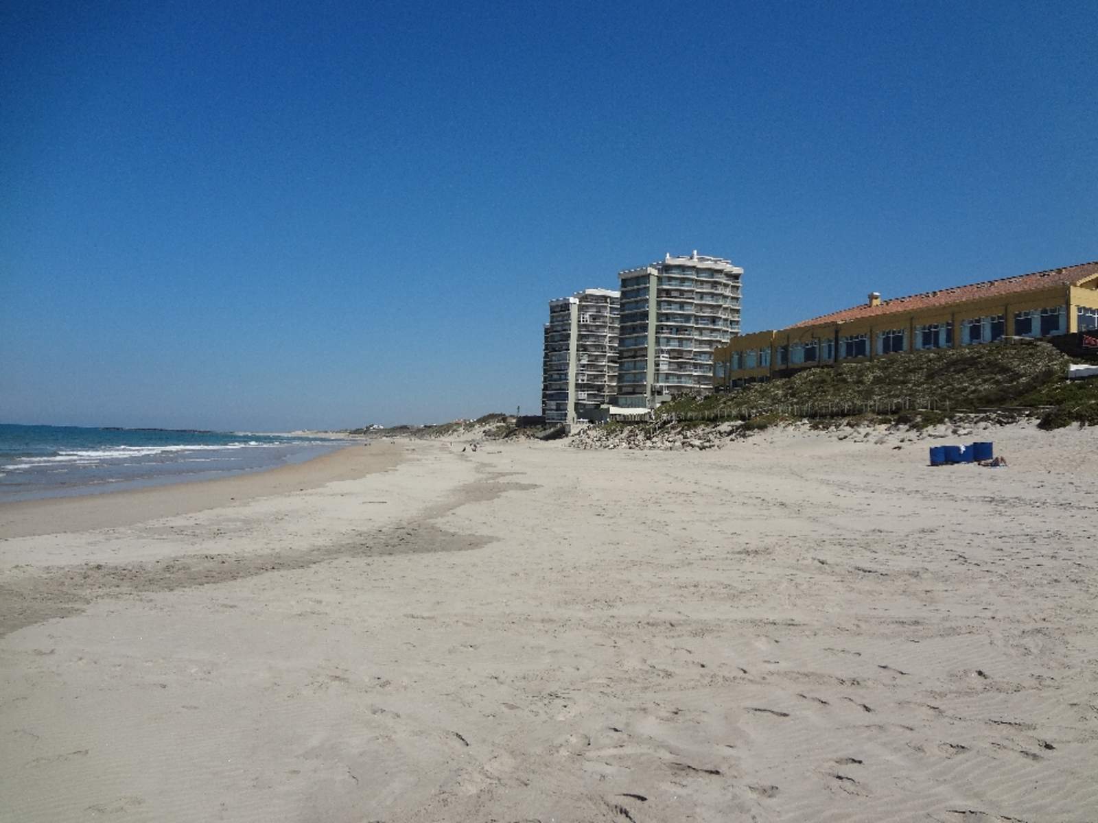 Wir verlassen den Holzsteg und wandern in Richtung Sandzunge, auf der Flussseite. Vor der Flussmündung gehen wir in einem großen Linksbogen in Richtung Meeresstrand. Der nun folgende Abschnitt des Weges verläuft immer entlang der Küste in Richtung Praia de Fão. Rechts hat man einen Blick auf im Meer vorgelagerte Felsen, die als Cavalos de Fão bezeichnet werden. Wir erreichen einen ersten Wellenbrecher, hinter dem der Strand von Fão beginnt. Markant sind drei Hochhäuser auf der linken Seite, auf welche wir nun zugehen.