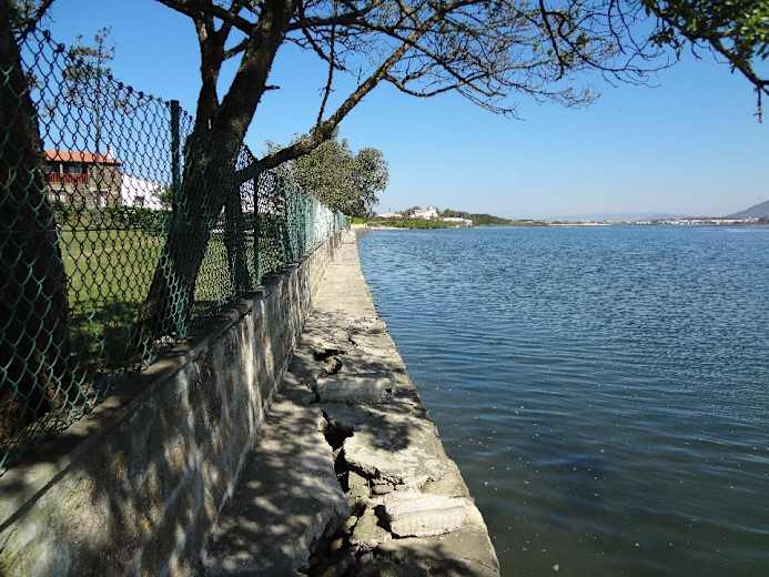 Nach rund 1 km geht der Weg in einen nicht ganz ungefährlichen Abschnitt zwischen dem Flusslauf rechts und einer Begrenzungsmauer links über: eine Art Kaimauer, die an manchen Stellen sehr schmal und auch etwas brüchig ist. Am Ende führt der Weg ein kurzes Stück eine Sandbucht entlang und verläuft dann nach links hoch über eine Wiese zu einer gepflasterten Straße. Diese ist für Radfahrer und Fußgänger gleichermaßen gedacht.