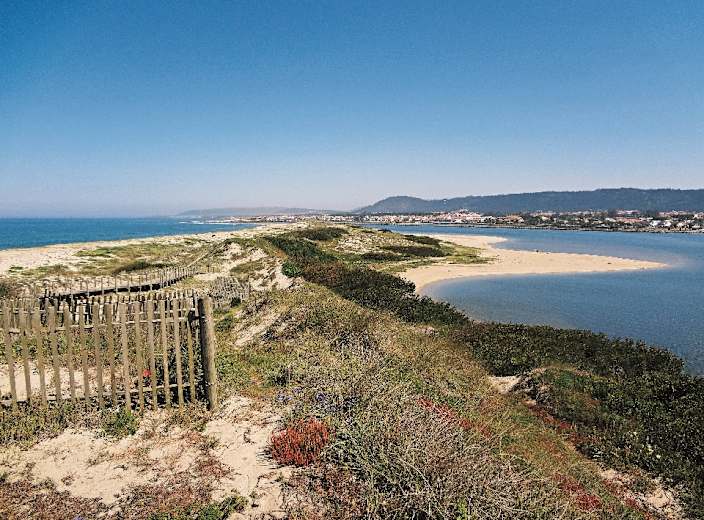 Wir folgen ihr rund 300 m, bis sie wieder in einen Holzsteg einmündet, den wir geradeaus einschlagen. Einen weiteren, links abzweigenden Holzsteg ignorieren wir und erreichen schon bald eine kleine Aussichtsplattform, von welcher wir einen schönen Blick auf die überwachsene Dünenlandschaft, auf die Flussmündung mit ihren kleinen Inseln sowie auf die Stadt Esposende haben.