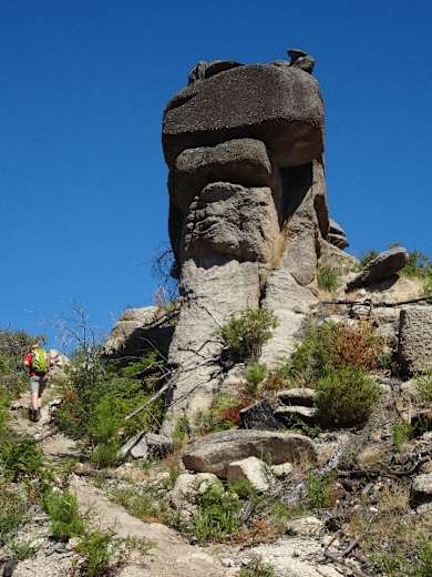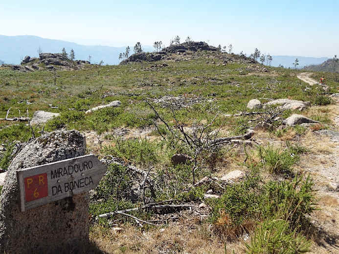 Wir erreichen einen breiteren Sandweg, auf dem wir der Markierung folgend nach links weiterwandern. Bei einer deutlich markierten Kreuzung zweigt vom Hauptweg ein kleiner Weg nach links in Richtung Miradouro da Boneca ab. Von hier aus steigen wir wieder rund 650 m leicht bergab, kommen an der Quelle von Boneca vorbei, bevor wir den eindrucksvollen Miradouro da Boneca erreichen, der auf einer Höhe von 750 Metern liegt. Von hier aus hat man wieder einen wunderschönen Rundblick in die umgebende Gebirgslandschaft und auf Gerês.
