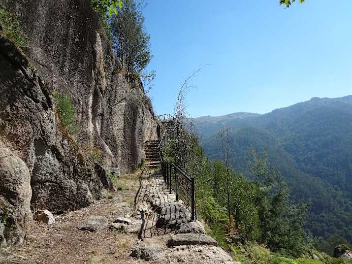 Auf Steinstufen steigen wir weiter bergan und der Weg wird allmählich steil, felsig und hält sich erst an der Bergflanke, später geht er in Serpentinen über. Dieser schönste Abschnitt des Weges verläuft zeitweise wieder im Schatten von Tamariskenwäldern. Zügig gewinnen wir an Höhe und erreichen eine Lichtung mit sehr schönen Blicken auf die Serra do Gerês. Der Weg geht in einen sehr breiten, weiterhin ansteigenden Gebirgspfad über. Diese Gegend wurde in den vergangenen Jahren immer wieder von Waldbränden heimgesucht.