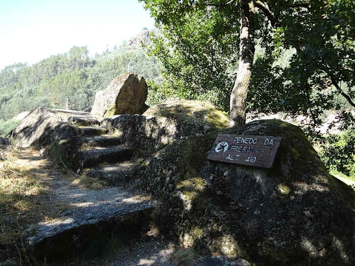 Nach links gehend steigen wir über Stufen zum ersten Aussichtspunkt, Penedo da Freira, hoch, der auf 370 Höhenmetern liegt. Nach einem kurzen Abstieg folgen wir einer Asphaltstraße nach links. Rund 300 m weiter zweigen wir nach rechts auf eine schmalere Sandpiste ab.