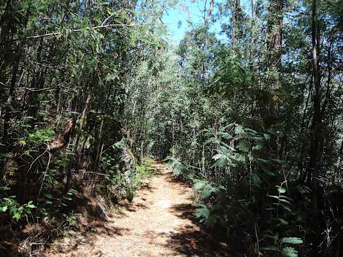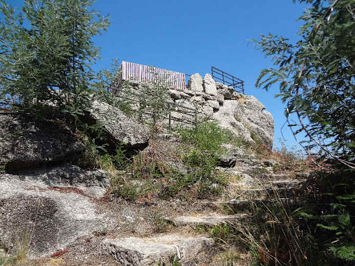 Nachdem wir einen Fußballplatz passiert haben, erreichen wir wieder den Wald. Dort steigen wir in einen steileren und schmaleren Pfad ein, der weitgehend im Schatten verläuft. Bald treffen wir erneut auf die Asphaltstraße, der wir rund 300 m nach rechts und leicht bergab folgen. Danach zweigt der Weg links ab und führt bergan. Wir passieren eine Holzschranke und folgen einem breiteren Sandweg, der uns nach kurzer Zeit zum Aussichtspunkt Fraga Negra auf rund 550 Meter Höhe bringt.