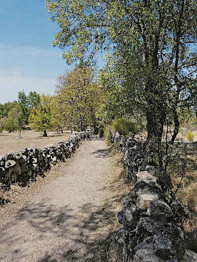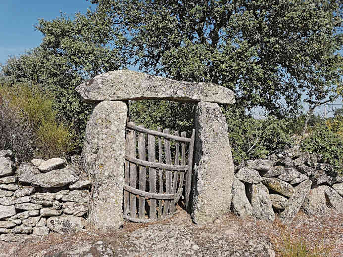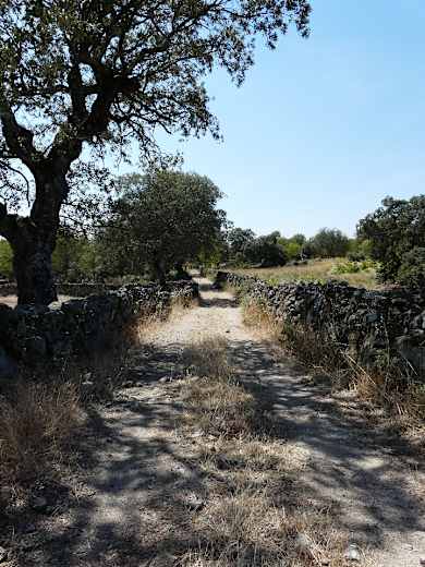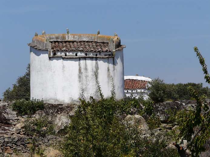 Bei nächster Gelegenheit zweigt der Weg wieder nach links ab. Um Aldeia Nova herum kann man sehr viele runde Taubenhäuser sehen, die attraktive Fotomotive sind. Wir wandern nun zwischen Steinmauern und Eichenbäumen auf einem schmalen Pfad durch eine traumhaft schöne Umgebung: Dies ist einer der schönsten Abschnitte der Rundwanderung. Bei einem kleinen Steinkreuz kommen wir auf eine breitere Straße, der wir geradeaus folgen, schon 10 Min. später erreichen wir das nächste Dorf, Pena Branca.