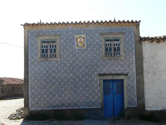 Nun geht der Weg in eine Asphaltstraße über. Bevor wir das Dorf erreichen, kommen wir rechts an der größeren Kapelle São Simão vorbei. Danach überqueren wir den Dorfplatz.