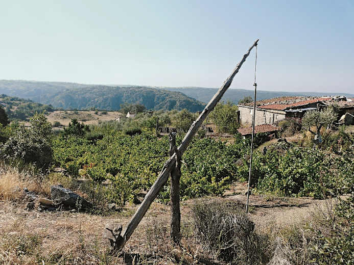 Nach weiteren 30 Min. erreichen wir den Dorfeingang von Vale de Aguia. Die großen Hallen auf der linken Seite dienen der Hühnerzucht. Schon kurze Zeit später überqueren wir den Dorfplatz, mit Brunnen, Bänken und einem Friedhof sowie einer Kapelle auf der rechten Seite. In der Mitte des Dorfes steht ein kleines Denkmal, auf dem ein Gedicht im örtlichen Dialekt„Mirandes“ und Portugiesisch zu lesen ist. Wir gehen links an der Kirche, danach an einem Brunnen und einem Steinkreuz vorbei in Richtung Aldeia Nova.