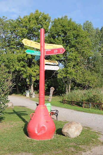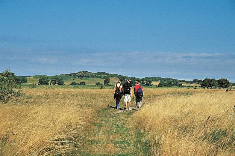 Am Enddorn steigen wir in Höhe von Sitzbänken die Böschung hinauf und wandern nach einem Fahrradparkplatz auf anfangs sandigem Weg inseleinwärts. Nach fünf Minuten biegen wir rechts in einen Plattenweg ein, der sogleich als Feldweg weiterläuft. Dieser hält zunächst auf den Leuchtturm zu, steigt dann jedoch als Pfad relativ steil zu einem Sattel mit Sitzbank auf. Bevor wir geradeaus wieder absteigen, gehen wir rechts auf den aussichtsreichen Swantiberg, Hiddensees zweithöchsten Gipfel. Wieder im Sattel führt der Pfad steil zu einer Lichtung mit weiteren Bänken hinab.