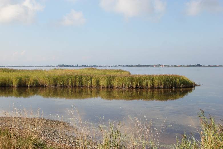 Von der Aussichtsplattform bietet sich ein eindrucksvoller Blick auf das Windwatt und die Anladungsflächen am Neubessin und hinüber auf die zu Rügen gehörende Halbinsel Bug. Wir wandern auf dem Altbessin zurück und wenden uns am Weidegatter rechts an einem Zaun entlang.