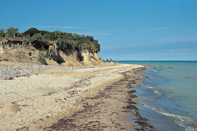 Ein stellenweise verwachsener Pfad führt durch dichte Sanddornhecken in wenigen Minuten zum Strand mit abermals schöner Aussicht auf den Bug. Am Strand gehen wir links zum Enddorn, hier beginnt ein Hochufer, das die ganze Nord- und Westküste des Dornbuschs umschließt.