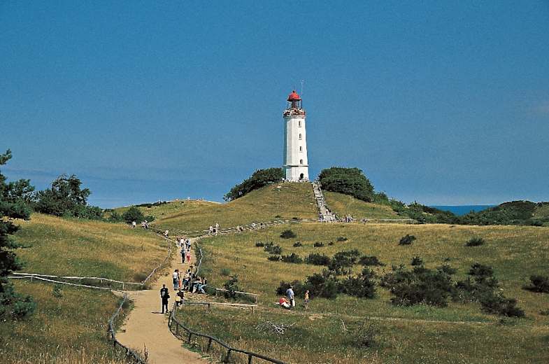 Ins bucklige „Hochland“ von Hiddensee (Deutschland): Der Leuchtturm auf dem Dornbusch ist weithin sichtbares Wahrzeichen von Hiddensee in der Region Rügen in Meckelnburg-Vorpommern.