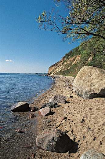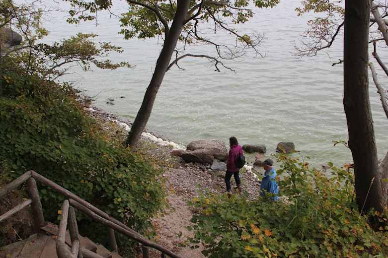 Kurz nach der Aussicht zieht der Weg an der Abbruchkante hoch und schwenkt dann links inseleinwärts. Sobald sich wieder der Blick auf den Bergrücken öffnet, bleibt ein rechts abgehender Pfad unbeachtet, gut 200 m darauf wenden wir uns an einer ausgeschilderten Gabelung nach rechts ins Nonnenloch hinab. Dort bietet sich ein Strandabstieg an, das letzte Stück auf einer Holztreppe. Unten am Ufer liegen große Findlinge.