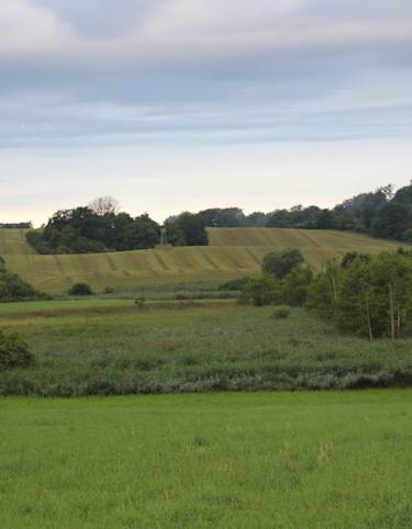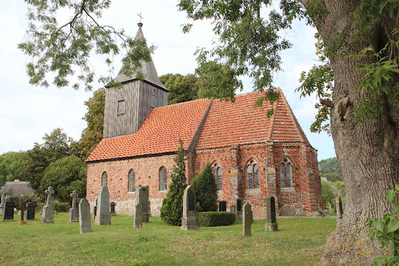 Wir steigen wieder zum Nonnenloch auf und folgen dem Pfad nun rechts. Es geht nochmals auf einen Kamm hinauf und dann nach Groß Zicker hinab. Am Ortseingang passieren wir das Landhaus Taun Hövt, ein kopfsteingepflastertes Sträßchen bringt uns am Pfarrwitwenhaus vorbei zurück zur Bushaltestelle bzw. zum Parkplatz an der Dorfkirche in Groß Zicker.