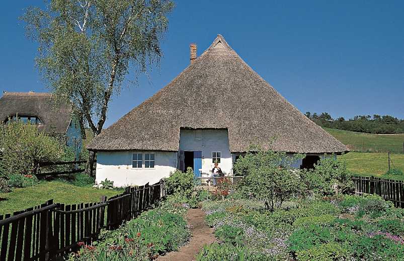 Panoramawanderung im Herzen der Halbinsel Mönchgut (Deutschland): Herausgeputzte Rohrdachhäuser mit bunten Blumenrabatten davor machen Groß Zicker zu einem liebenswerten Ort – mit dem Pfarrwitwenhaus aus dem 18. Jahrhundert steht hier zudem eines der fotogensten Wahrzeichen Rügens in Mecklenburg-Vorpommern.