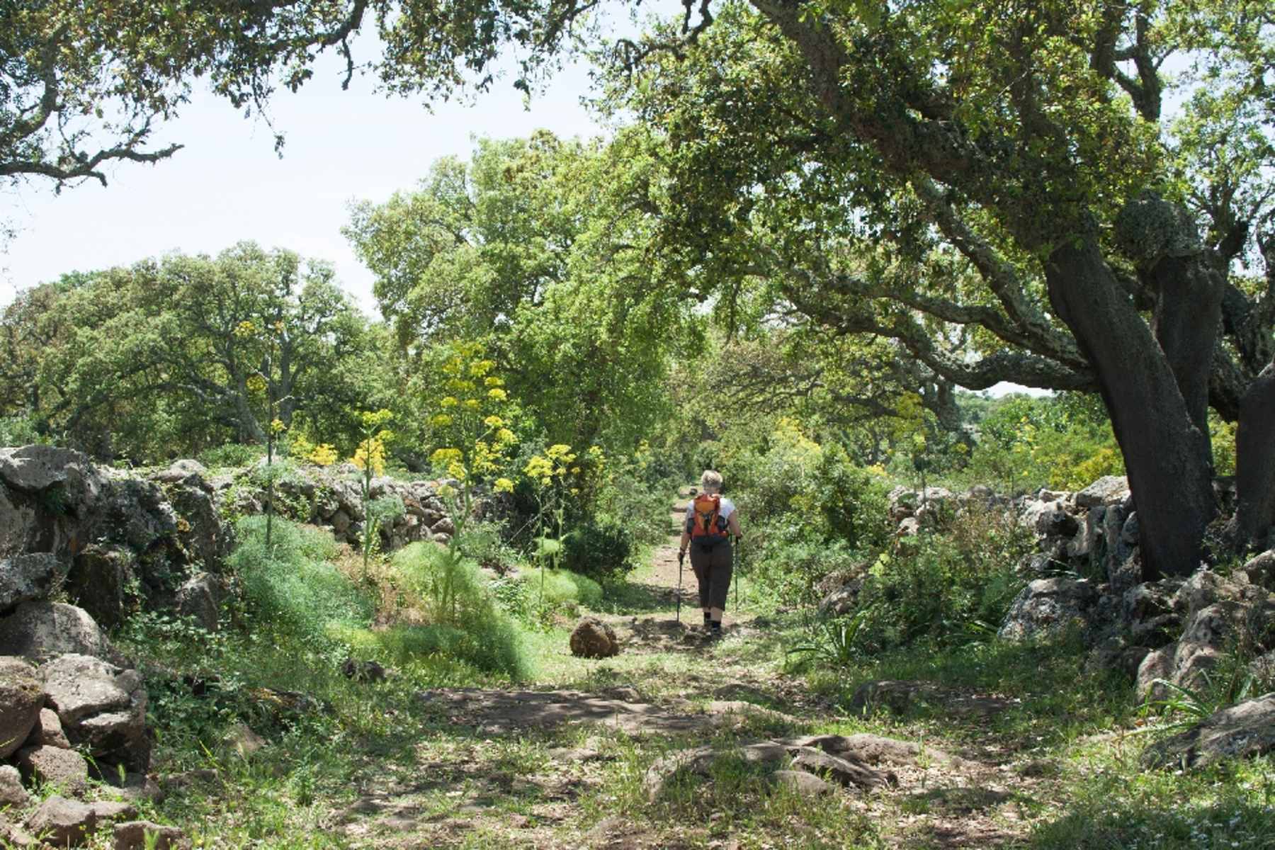 Wir biegen scharf links ab, geradeaus geht es zu einem Pferch mit Steinmauer und Maschendrahtzaun. Nach wenigen Minuten erreichen wir den Giardino botanico della Giara auf der rechten Seite, in dem Giara-typische Pflanzen zu sehen sind. Auf unserer Route nehmen wir einen Seitenweg von links kurz hinter dem Garten, einen weiteren kurz darauf ebenfalls von links kommend mit auf.