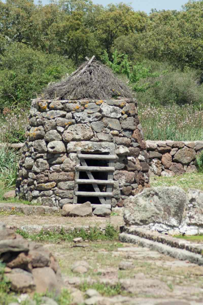 Auf der folgenden Wegstrecke durch hüfthohe Macchia nehmen wir nach etwa 15 Min. Gehzeit einen von links einmündenden Pfad mit auf, bevor wir uns gleich darauf an einer Gabelung rechts halten. Nur 1 Min. später gelangen wir zu einer offenen, von Korkeichen eingerahmten Wiesenfläche mit zwei runden Schafställen (sardisch „pinnètta“) und zwei Steinpferchen. In einem der beiden Pferche sind drei kleine Unterstände für die Schafe, gegenüber dem Pferch, etwa 25 m entfernt, sehen wir einen Querweg, auf dem wir links abbiegen (rechts entlang geht es zur Nuraghe Tuturuddu).