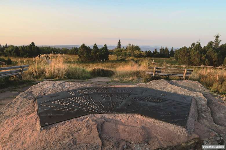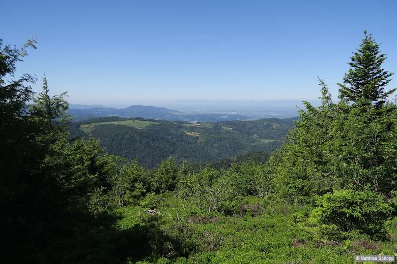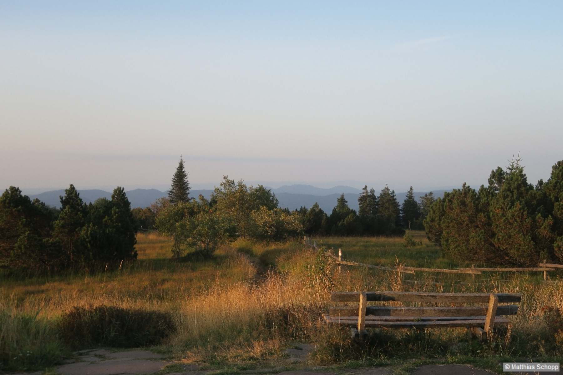 Der Westweg führt weiterhin im Gleichlauf mit dem Renchtalsteig um den Plankopf herum zur Verzweigung Schwabenrank, 886 m, und im Anstieg rechts an der Schutzhütte vorbei zum Schurkopf. Die sturmentwaldeten Gipfelflächen selbst sind für Wanderer nicht zugänglich. Da unsere Route auf der Ostseite des Bergkamms verläuft, ist vom Verkehrslärm der Schwarzwaldhochstraße bislang so gut wie nichts zu hören. Allmählich nimmt der gehtechnische Anspruch wieder etwas zu. Ehe am Parkplatz Steinmäuerle der Schlussspurt zum höchsten Punkt der Tour beginnt, lohnt noch der kurze Abstecher zur Aussichtsplattform. Kurze Zeit später stehen wir auf dem von Grindenvegetation bestandenen Schliffkopf, 1055 m, eine Panoramatafel benennt die markanten Geländepunkte im Blickfeld.