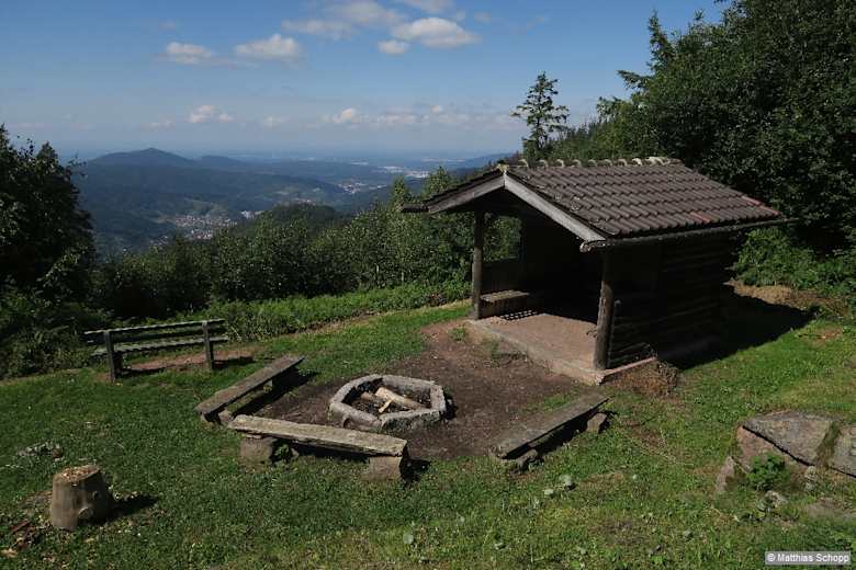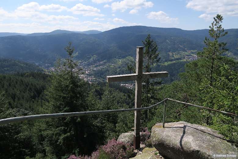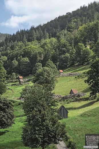 Am Bahnhof in Forbach, 305 m, starten wir in einen gleichsam langen, wie eindrücklichen Wandertag. Bis zum Hohloh wird die Route vom Westweg vorgezeichnet, dessen rote Raute zunächst nordwärts den Gausbacher Ortsrand ansteuert, hier rechts eine Geländestufe erklimmt und schließlich aussichtsreich entlang von Obstwiesen in einem kurzen Zwischenabstieg dem Hexenbrunnen, 378 m, zustrebt. Im oberhalb gelegenen Kauersbachtal bestimmen zahlreiche Heuhütten das Landschaftsbild. Der Westweg hingegen schwingt links in den Wald, wo die Route in etlichen Serpentinen emporsteigt. Nach einer Weile ist der Aussichtspunkt am Kleinen Latschigfelsen mit Blick auf Forbach ausgeschildert, kurz darauf ist der Pavillon auf dem Latschigfelsen, 724 m, erreicht, ein herrlicher Rastplatz.