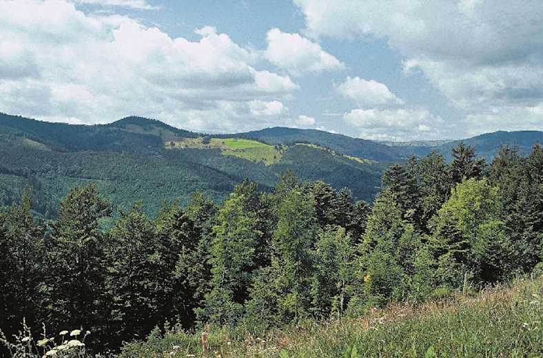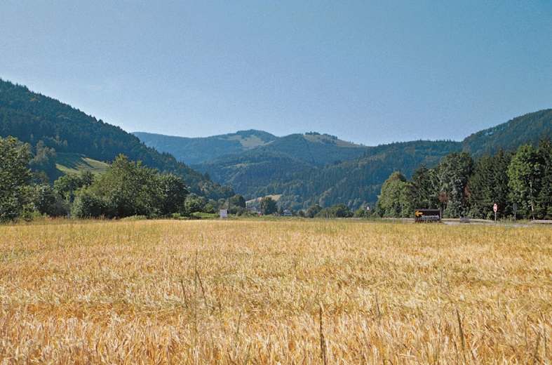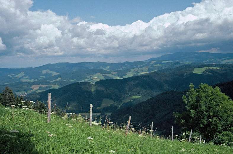 Hier übernimmt vorübergehend die blaue Raute die Routenführung, eine Zeitlang in Fichtenforsten, ehe die Matten beim Almgasthof Höfener Hütte den Blick auf das Höllental und ins Dreisamtal frei geben – ein idealer Ort zur Einkehr.