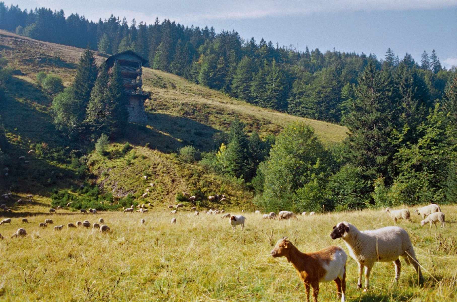 Die blaue Raute führt vom Berggasthof kurz Richtung Gisiboden, bis die Wanderwegeschilder steil rechts hinauf zum nahen Hasenhornturm auf dem Gipfel leiten; der 20 m hohe hölzerne Aussichtsturm bietet ein Panorama vom Belchen über den Stübenwasen und zum Feldberg sowie hinab ins Wiesental.