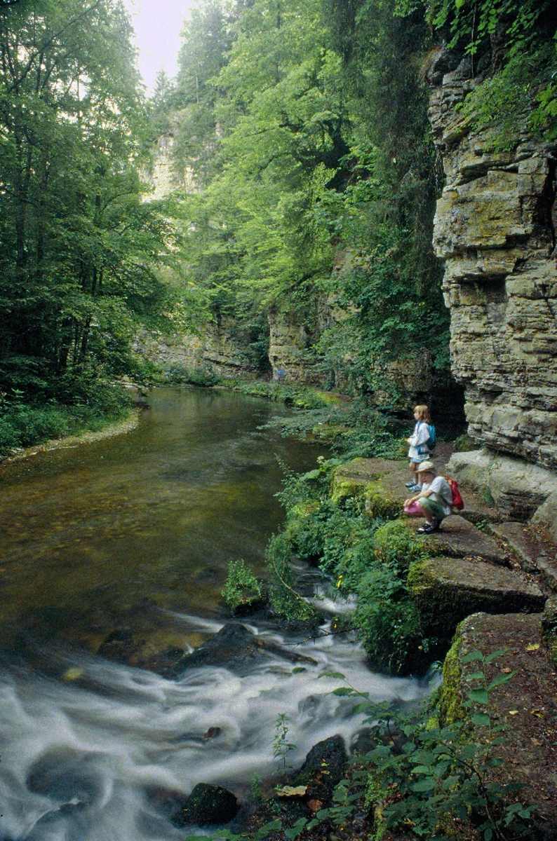 Auf dem Bachheimer Steg mit Blick auf den fast 100 m hohen Josefsfelsen wechselt der Steig ans Südufer und erreicht die Wutachaustritte, wo das knapp 2 km weiter flussaufwärts versickerte Wasser wieder aus dem klüftigen Gestein tritt. In der imposanten Felsschlucht führt der Steig flussabwärts zum überdachten Kanadiersteg an der Gauchachmündung.