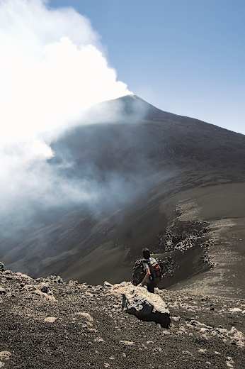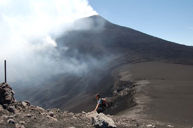 Häufig vom ohrenbetäubenden Spektakel kleinerer Explosionen begleitet, setzen wir unseren Weg über den Grat zu den Pizzi Deneri (2.847 m) fort. Von dort genießen wir einen großartigen und zugleich ungefährlichen Ausblick auf die dampfenden Kraterkessel. Zur Verarbeitung der Einblicke in die Vulkanaktivitäten haben wir aber nicht viel Zeit, denn eine vergnügliche Abfahrt auf einer Aschebahn bis fast ganz hinunter bringt uns vielleicht schneller ans Ziel, als uns lieb ist.