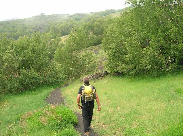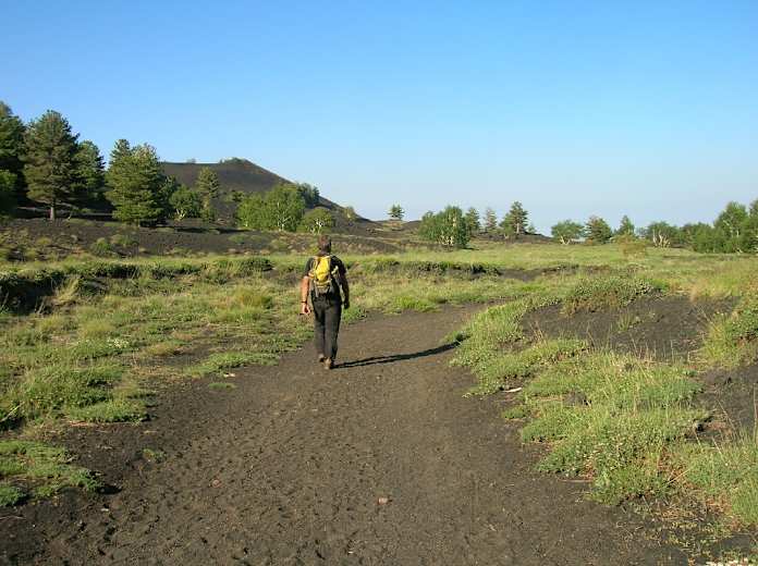Vom Rifugio Citelli gehen wir auf der Zufahrtsstraße zunächst abwärts ein Stück zurück und biegen gleich in der Rechtskurve nach links auf einen Pfad durch ein Birkenwäldchen ab. Vereinzelte rote Punkte markieren den deutlichen Weg, der Birkenwald wird etwas lichter und vor einer aus Lavasteinen erbauten Höhle schwenkt der grusige Ascheweg nach links auf einen Grashang.