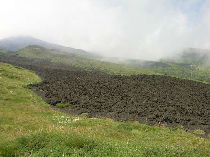 Weiter geht es auf einer mit kugeligen Astragalus-Polstern bestandenen Aschebahn rechts hoch. Wir erreichen einen noch unbewachsenen Lavastrom, an dessen linkem Rand wir weiter den mit einzelnen Polstern gespickten Hang hinaufsteigen. Vorbei an einer kleinen Grotte (2.045 m) erreichen wir das spitz zulaufende obere Ende des Lavastromes; hier quert ein mit Holzstöcken markierter Pfad den Hang.