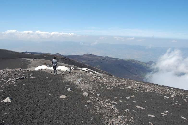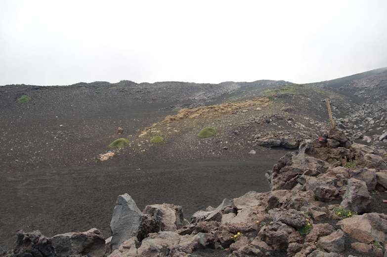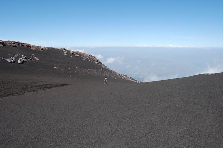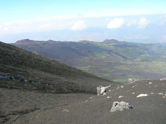 Für den Abstieg überschreiten wir den Gipfel, gehen links an den weißen Kuppen des vulkanologischen Observatoriums vorbei und gelangen geradeaus in einen kleinen Sattel. Links von uns erstreckt sich die weite Ebene Piano delle Concazze, über die eine Fahrpiste weiter zu den Kratern hinaufführt. Von diesem Sattel folgen wir der hier beginnenden Ascherinne an ihrer linken Seite nach rechts abwärts.