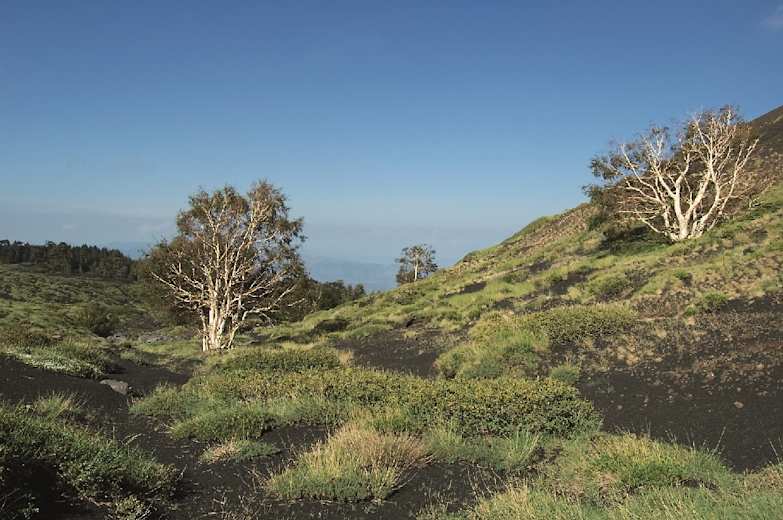 Hinter einem Holzgatter bleiben wir auf dem Hauptweg geradeaus und an der folgenden Verzweigung rechts. Inmitten des Waldes aus mehrstämmigen Birken passieren wir eine steingemauerte Hütte links des Weges und halten uns weiter auf dem breiten Ascheweg bald wieder durch offenes Gelände. Links von uns erheben sich die Kraterkegel des Monte Sartorio, und bald stoßen wir – wieder im Birkenwald – durch eine grüne Eisenschranke auf die Zufahrtsstraße zum Rifugio Citelli, auf der wir nach rechts wieder unseren Ausgangspunkt erreichen.