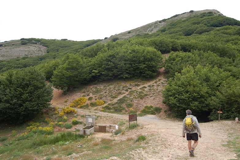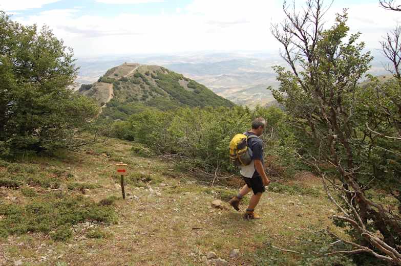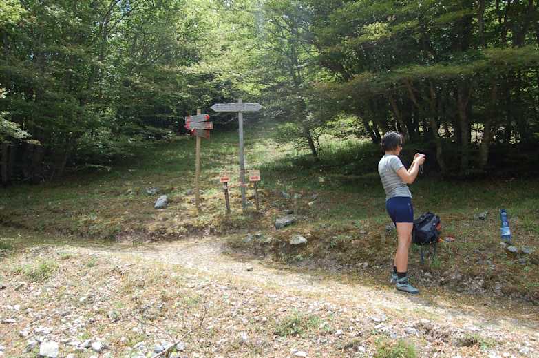 Wir queren einen weiteren Talgrund, kommen an den Nebrodi-Tannen 16 und 17 vorbei und gewinnen in weiten Serpentinen durch den Buchenwald an Höhe. Schließlich stoßen wir auf einen den Hang querenden Weg; rechts geht es nach Polizzi Generosa, wir folgen weiter dem Sentiero 16 Richtung Piano Grande nach links.