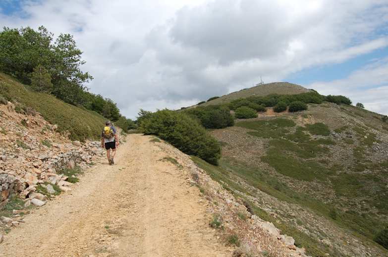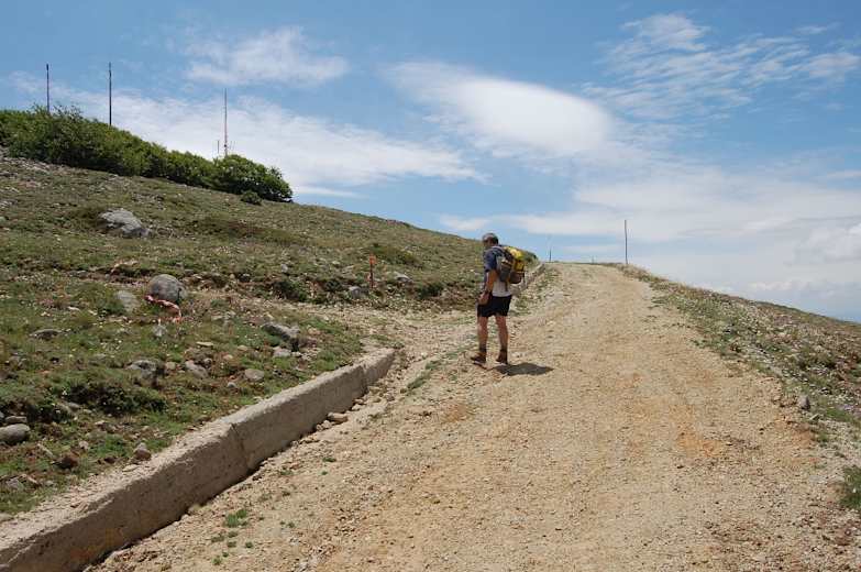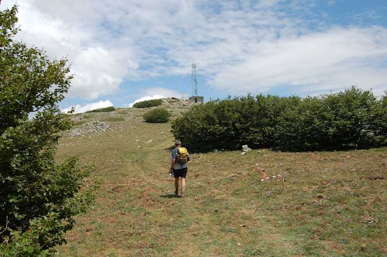 Wir nehmen den linken Ast durch eine Schranke, nunmehr auf dem Sentiero 3a Richtung Monte San Salvatore. Wir halten auf eine mit Antennen bestandene Kuppe zu und bleiben nach zwei Serpentinenkehren an einem Rechtsabzweig auf dem Hauptweg geradeaus. Der Weg beschreibt einen scharfen Rechtsbogen. Kurz vor fünf dünnen Antennenstäben verlassen wir den breiten Weg im spitzen Winkel nach links, passieren eine eingezäunte Gittermastantenne rechts und sehen nunmehr unser Gipfelziel mit einem Betonpfosten vor uns.